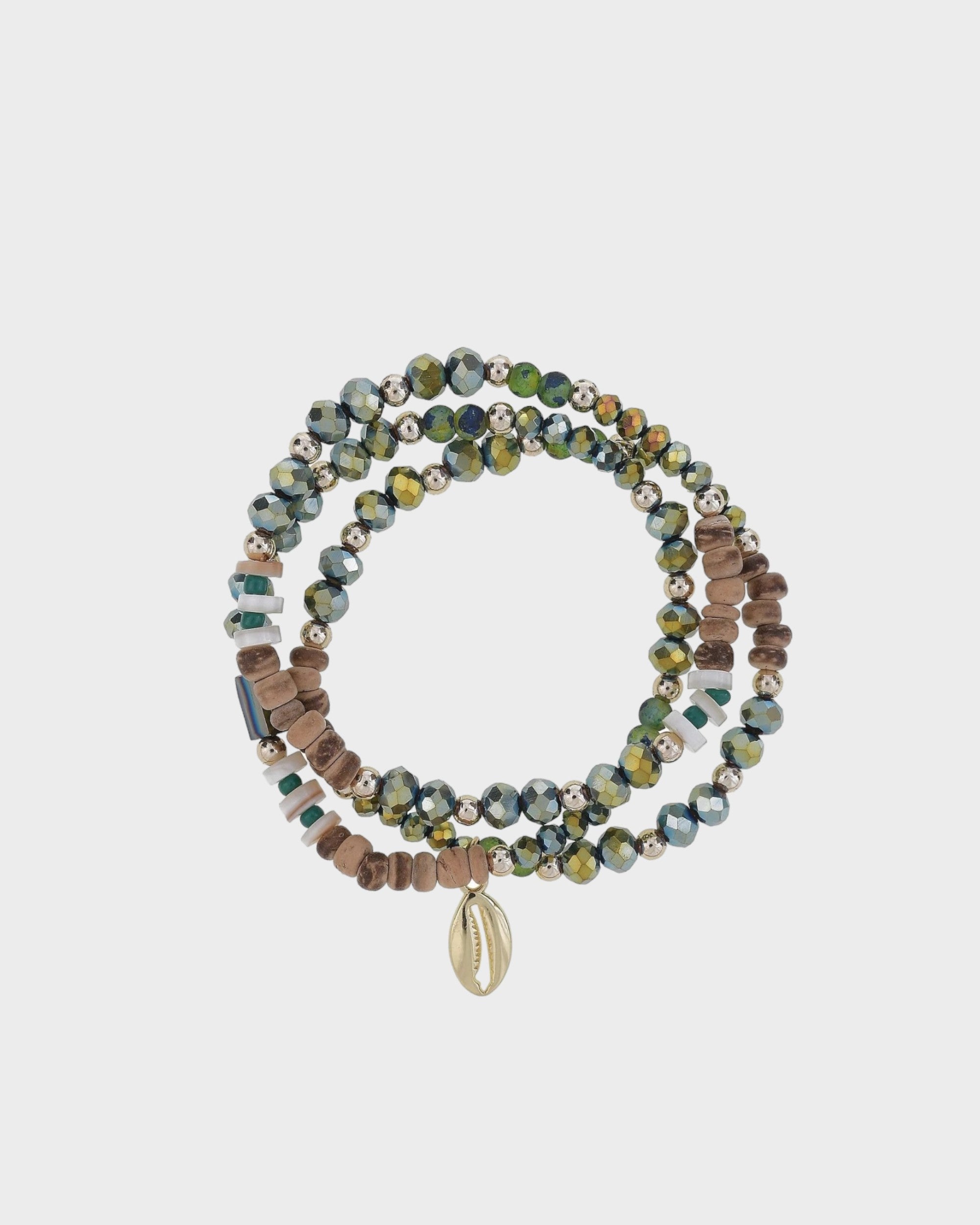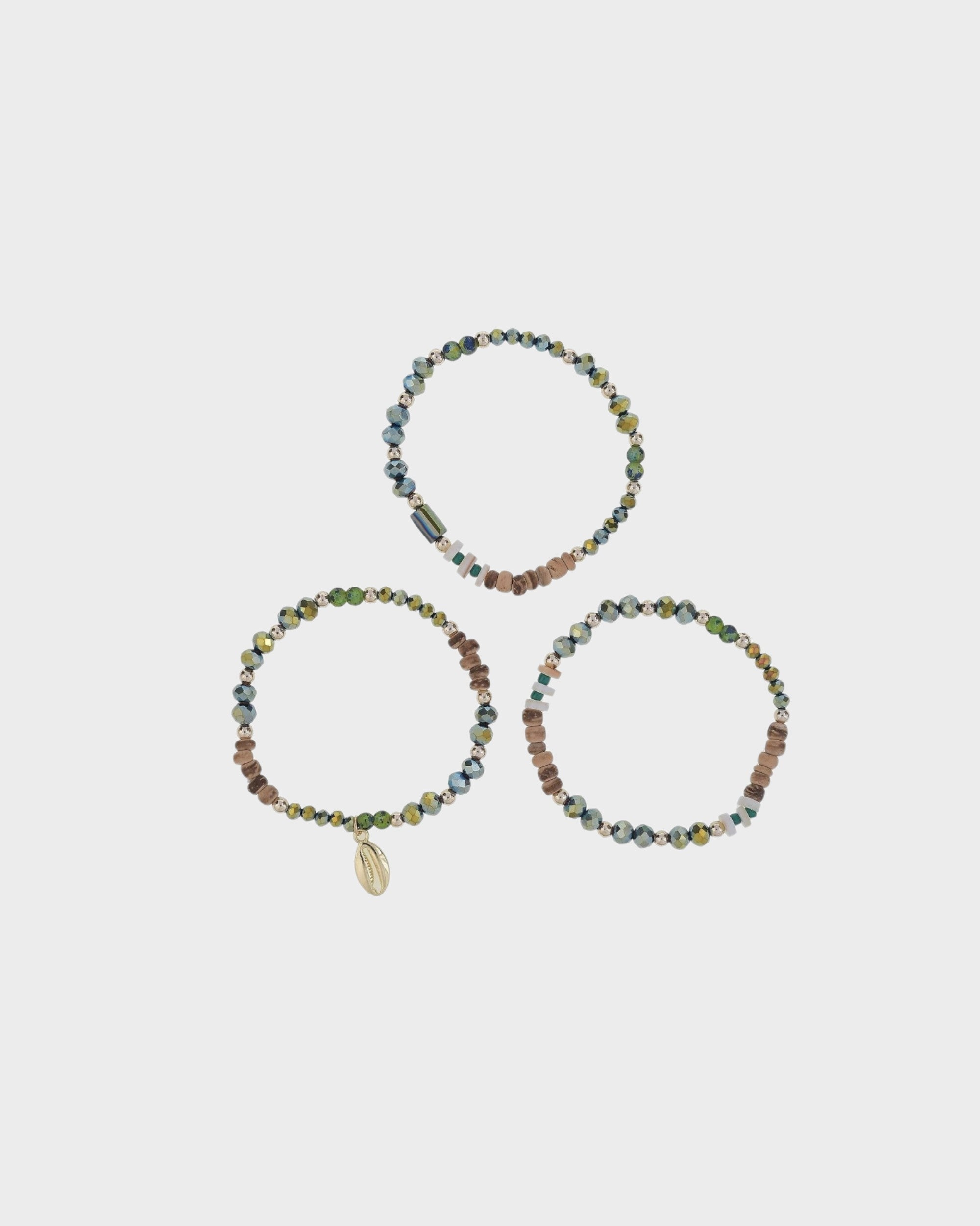 Presenting the mesmerizing Crystal stretch 3 pcs Bracelet set - a stunning blend of style and sophistication. Accented with sparkling green crystals ,golden beads and a distinctive gold cowry charm, this accessory adds a touch of glamour and comfort to any outfit. Its stretchy design allows for effortless wear, while the inclusion of wooden beads symbolizes growth, life, and a deep connection to nature. A must-have for any jewelry collection.