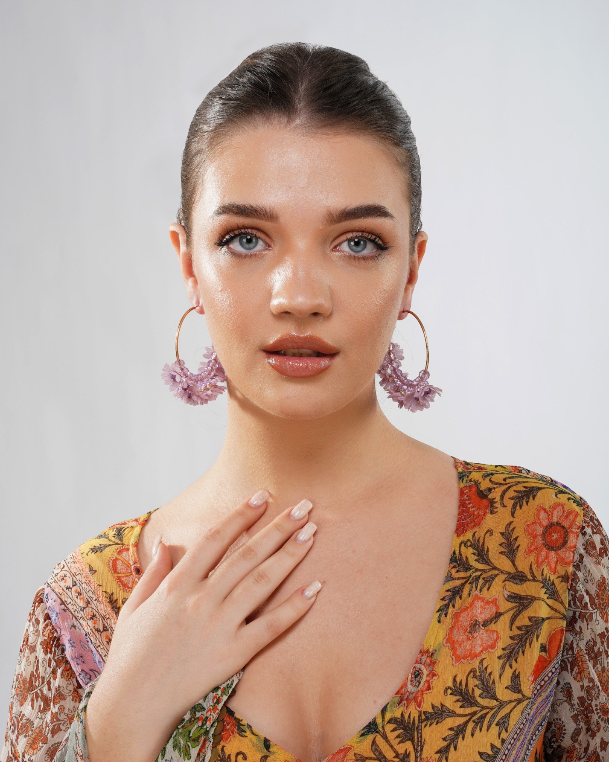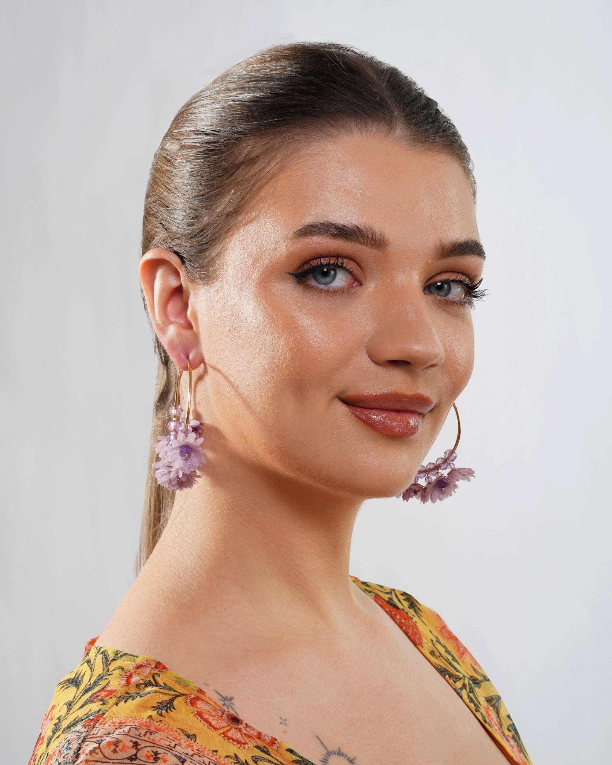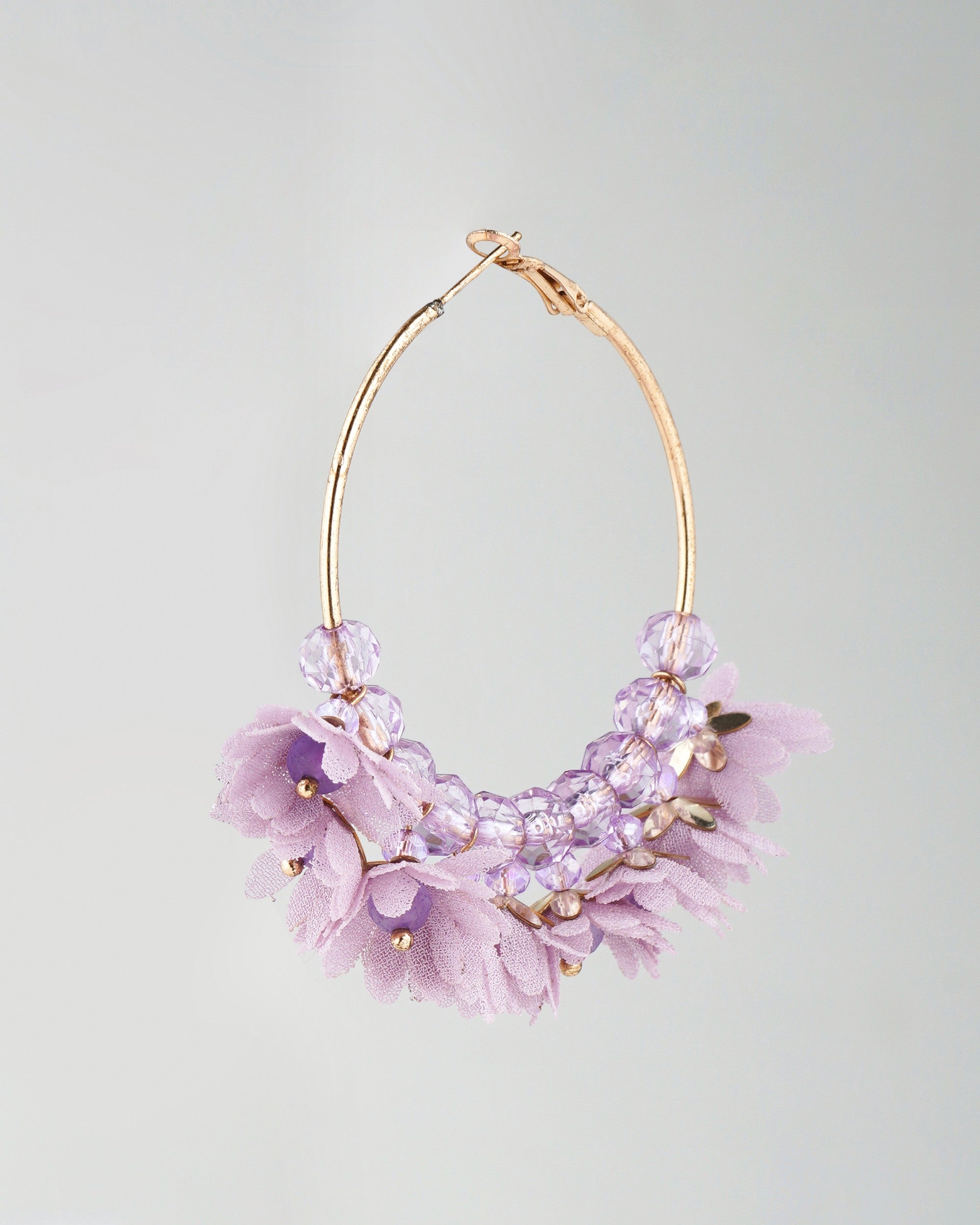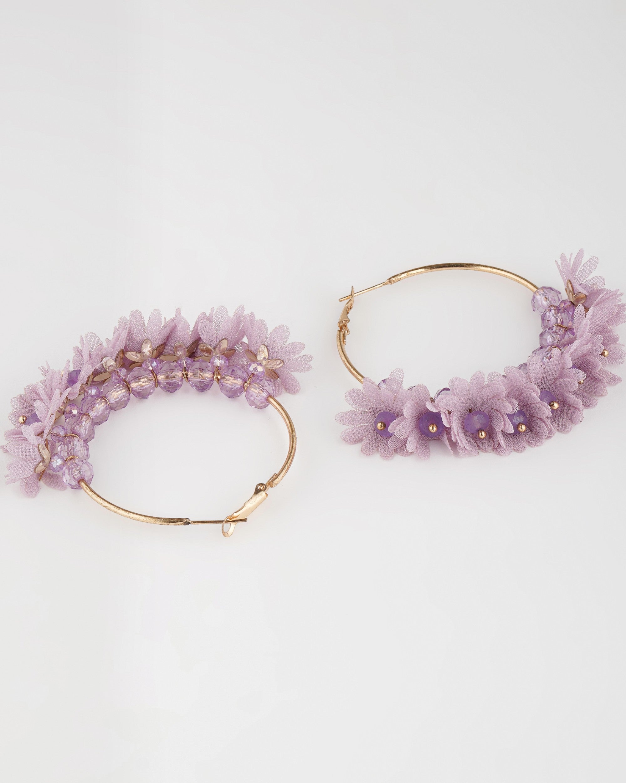 Upgrade your accessory collection with these elegant purple fabric flower hoop earrings accented with gold. Versatile for any outfit, they combine floral charm with sophistication, perfect for a night out or everyday wear. Stand out and receive compliments with these stunning hoops.