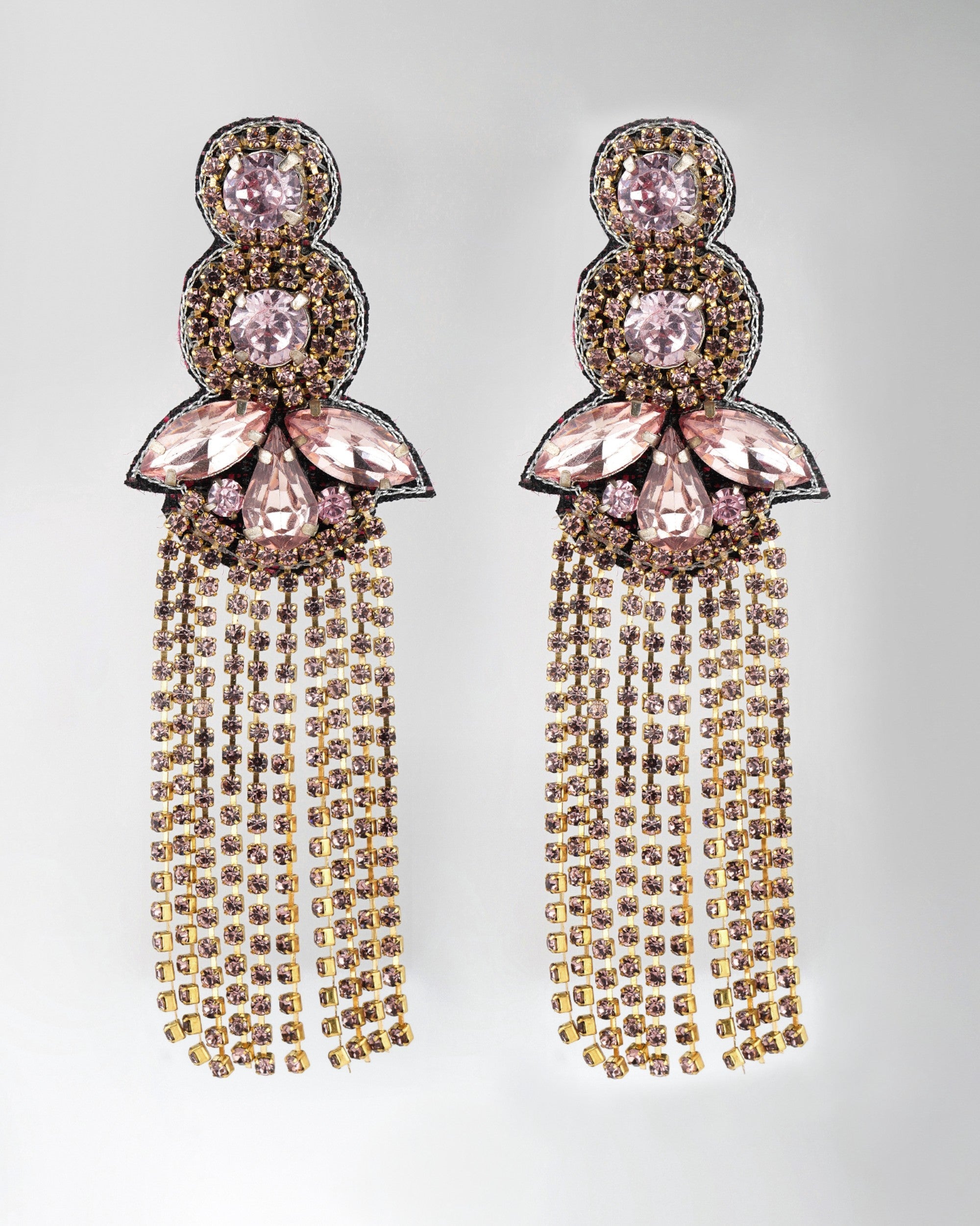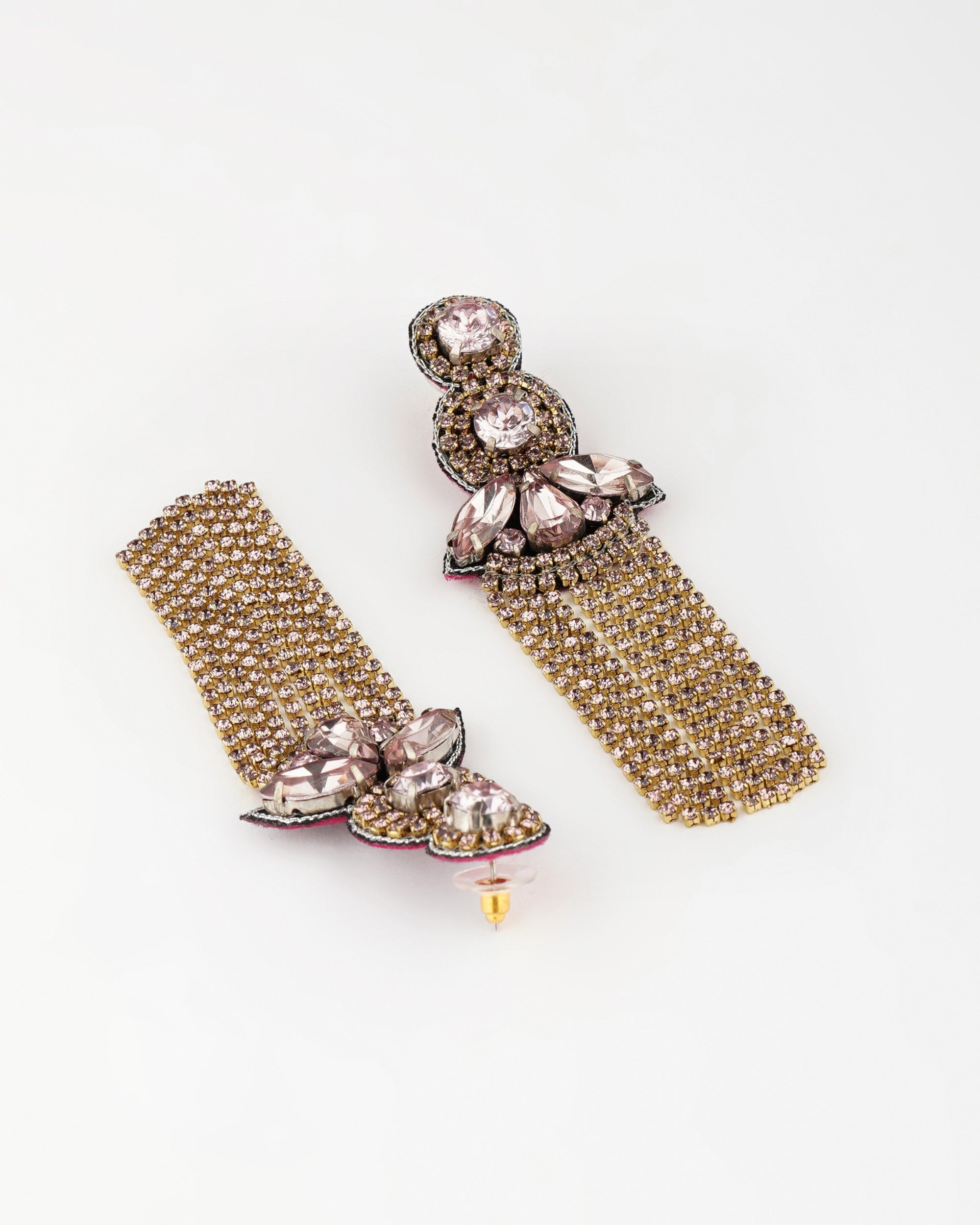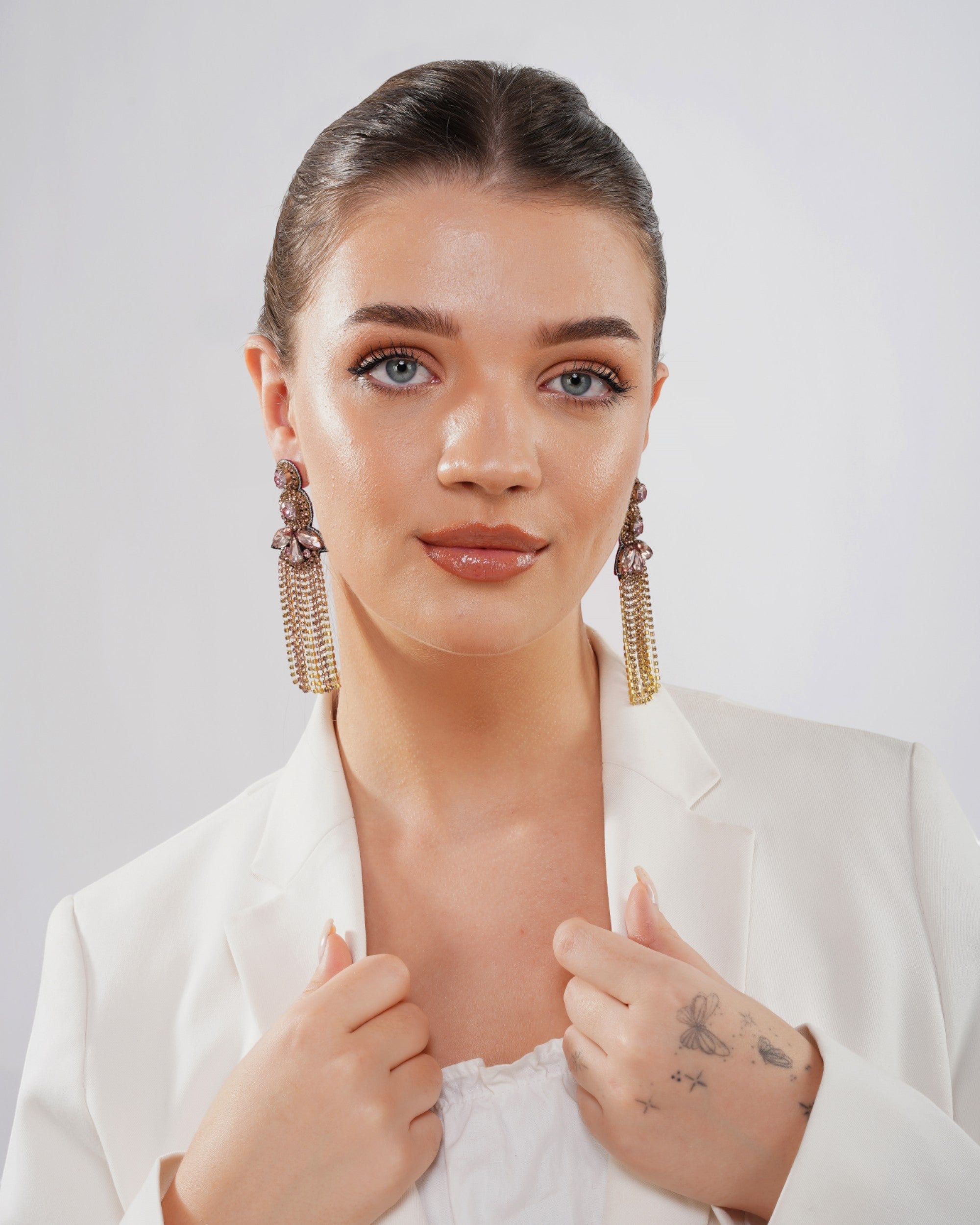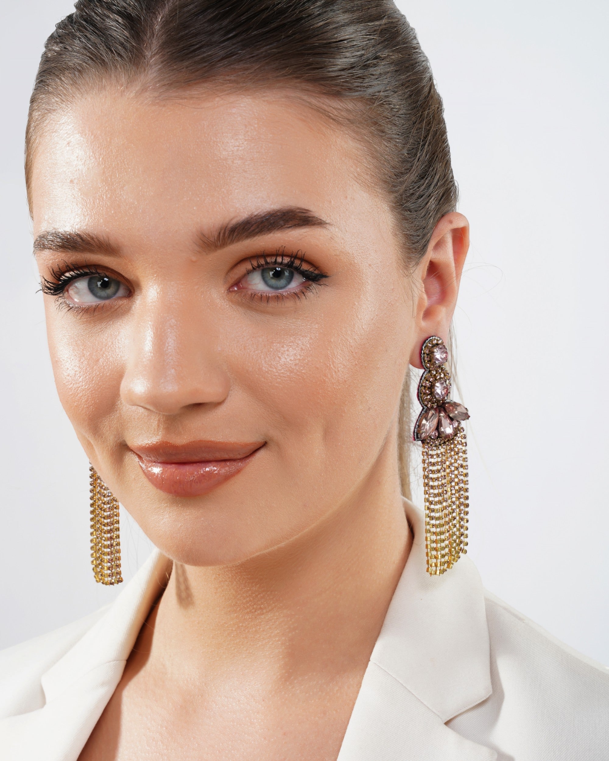 These exquisite earrings are crafted from high-quality gold, elegantly adorned with sparkling crystals that catch the light beautifully. Their sophisticated design makes them a perfect accessory for both formal occasions and everyday wear, adding a touch of luxury to any outfit.