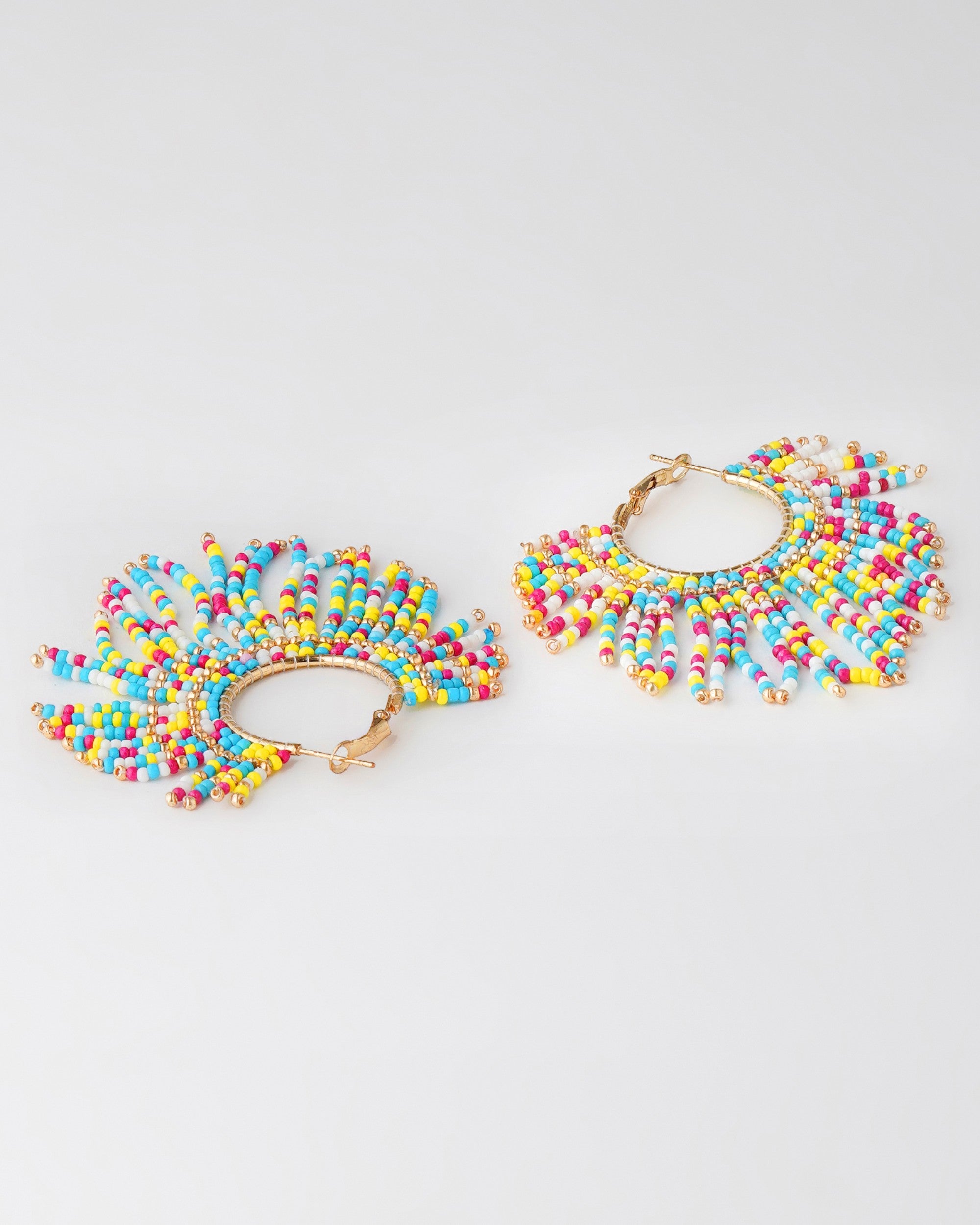 Expertly crafted with a mix of dainty Illuminating, Fuchsia Fedora, and blue seed beads, this classic gold hoop necklace features a playful tassel design that adds a touch of flirtatiousness to any outfit.