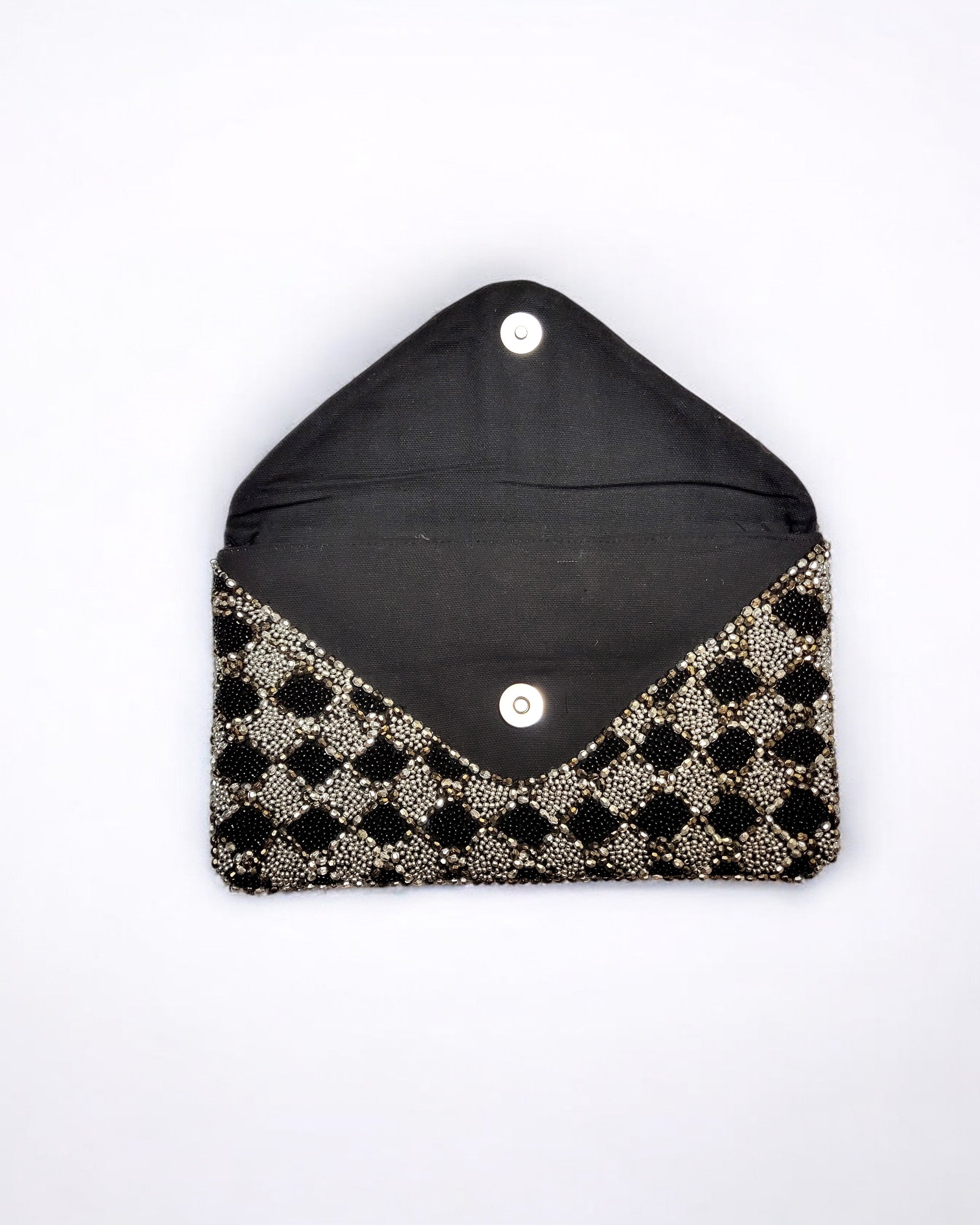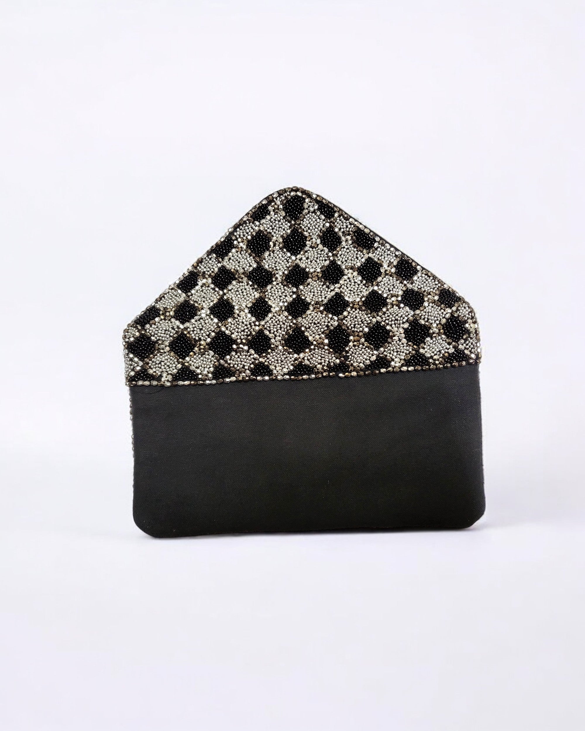 This stunning evening clutch bag features a chic design crafted from eye-catching black and silver beads, making it the perfect accessory for any night out. Its sleek silhouette and shimmering finish add a touch of glamour to your outfit, ensuring you stand out at any event. With just enough space for your essentials, this clutch is both stylish and practical, making it a must-have for your evening wardrobe.