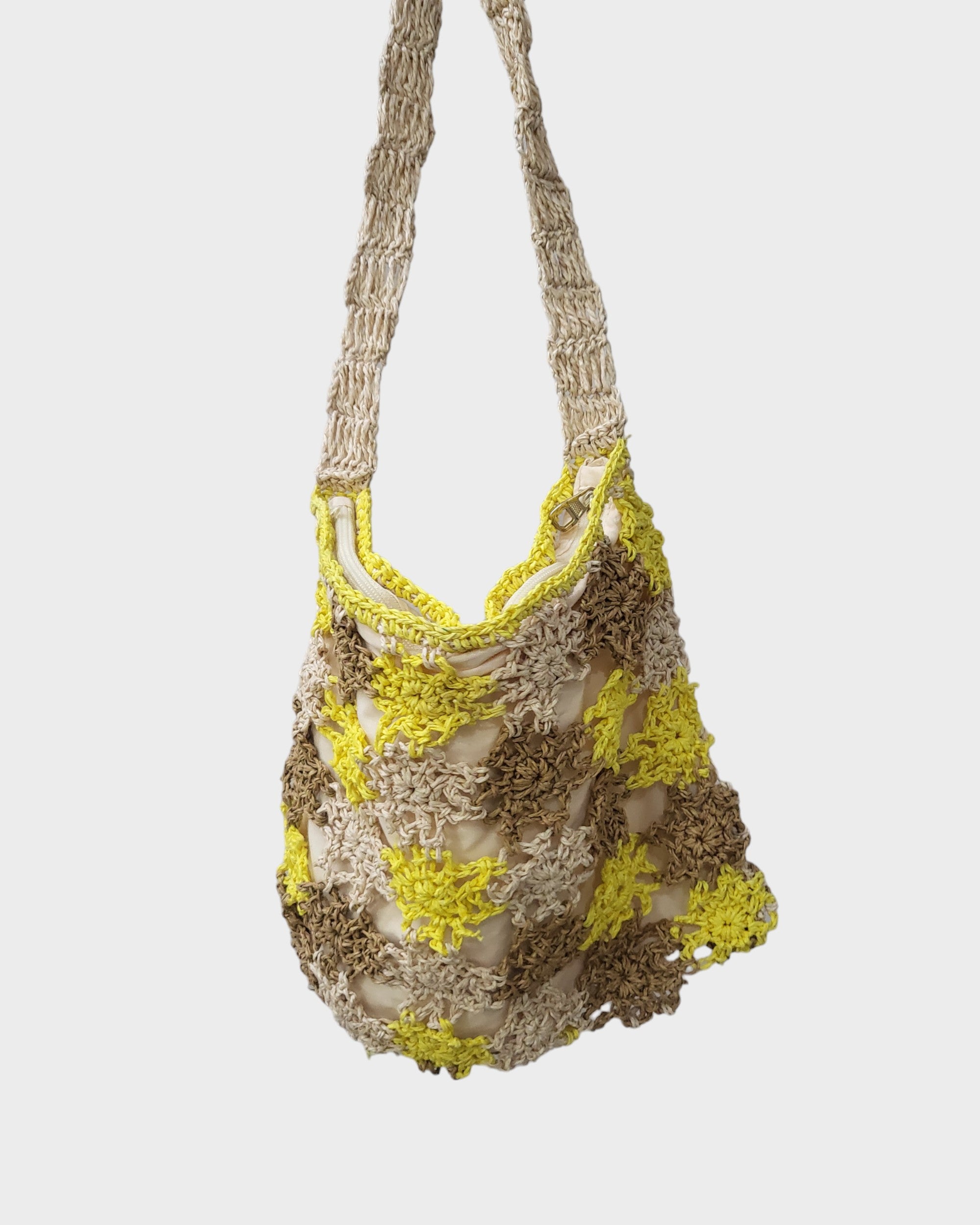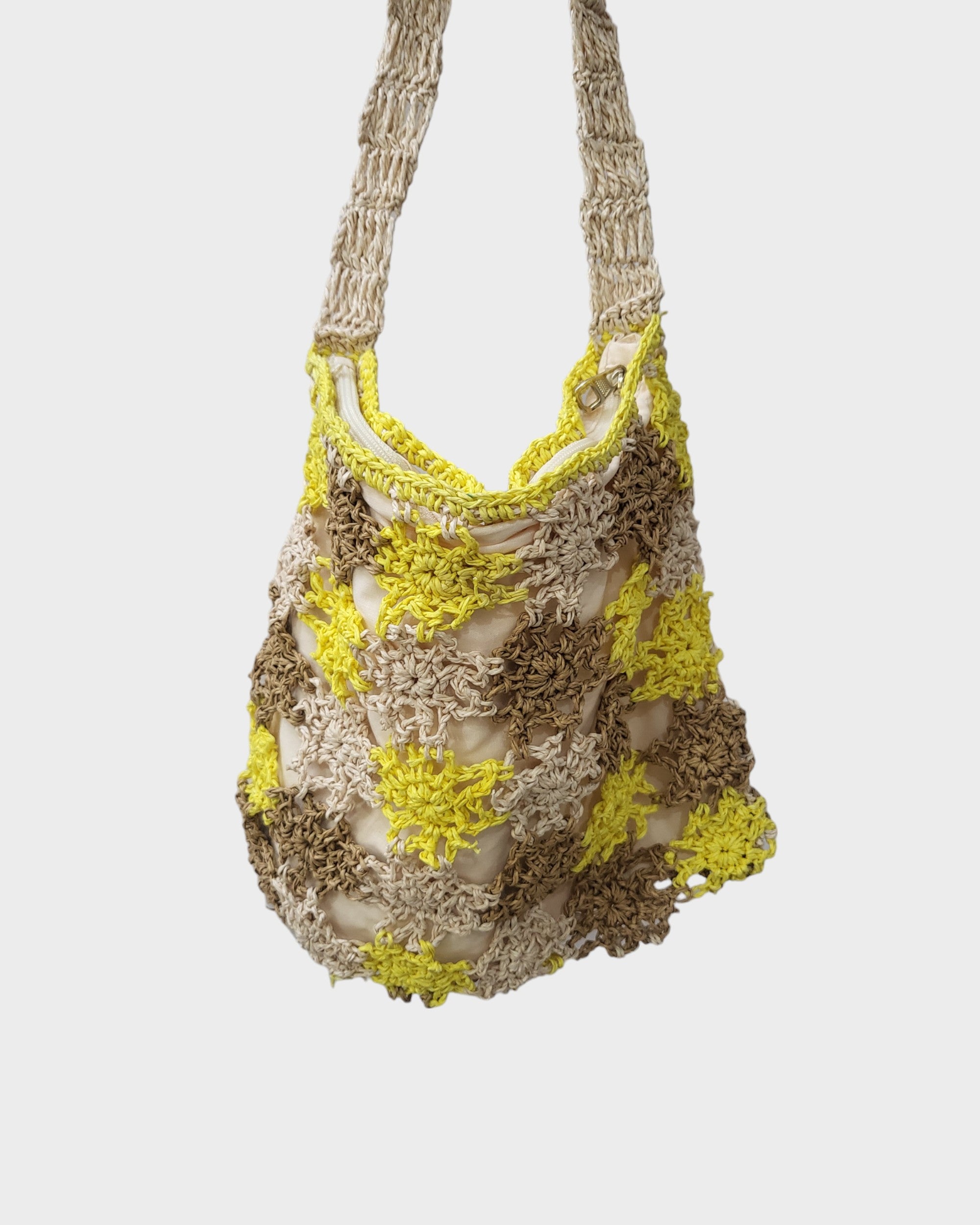 This exquisite Crochet Raffia Bag features a vibrant yellow and brown design, showcasing intricate craftsmanship that adds a touch of elegance to any outfit. Perfectly suited for both casual outings and special occasions, the bag is not only stylish but also practical, offering ample space for your essentials. Its unique texture and color combination make it a standout accessory, while the durable construction ensures longevity. Hang it on a hook for a charming display or carry it with confidence wherever you go.