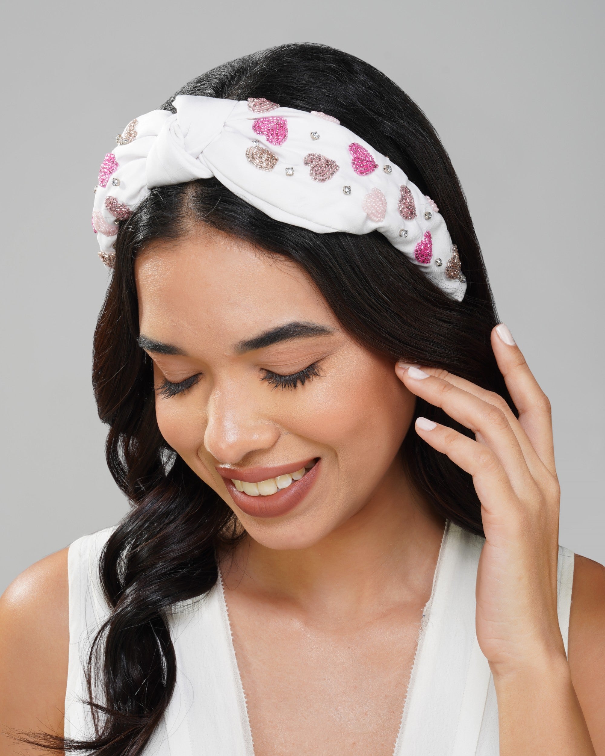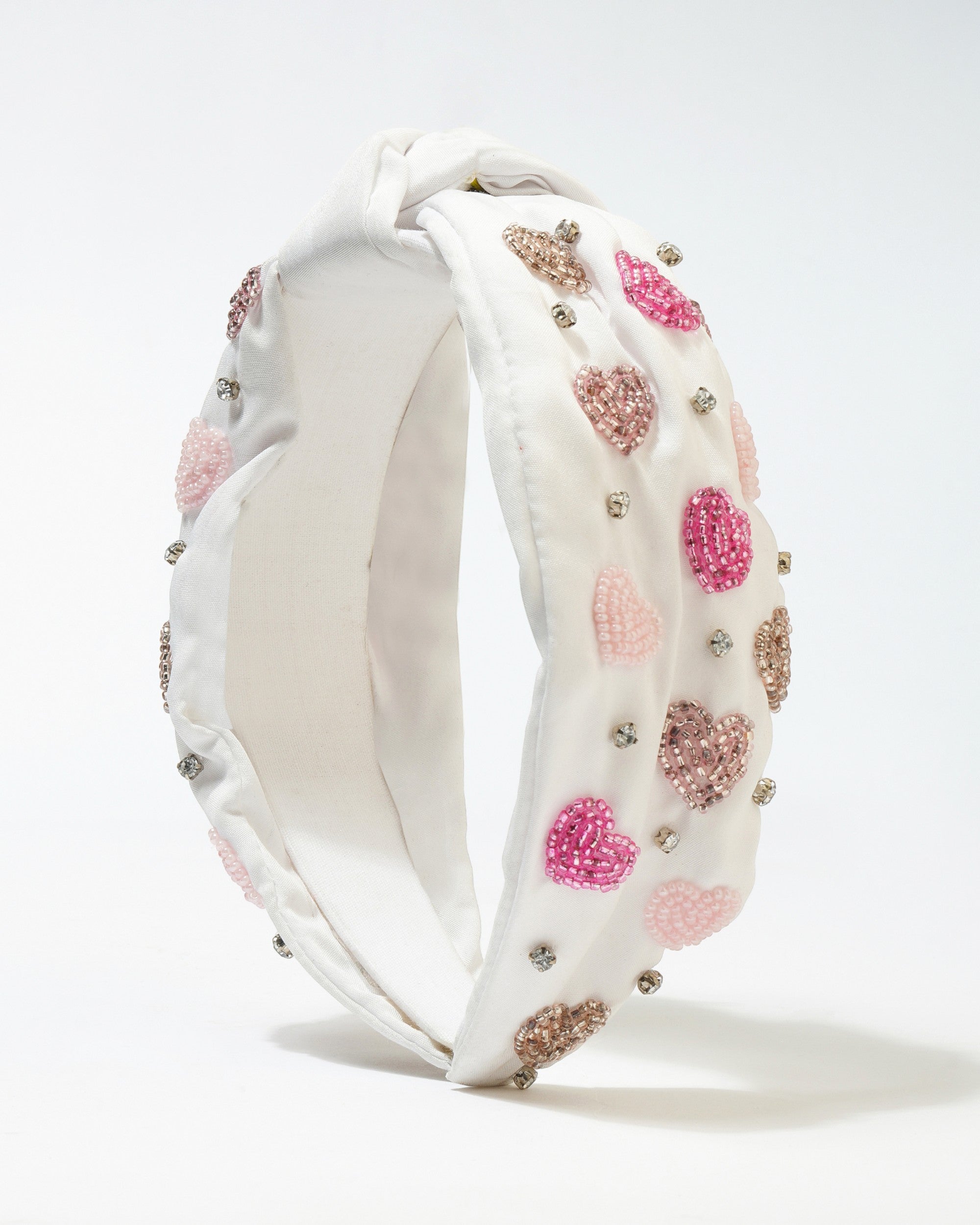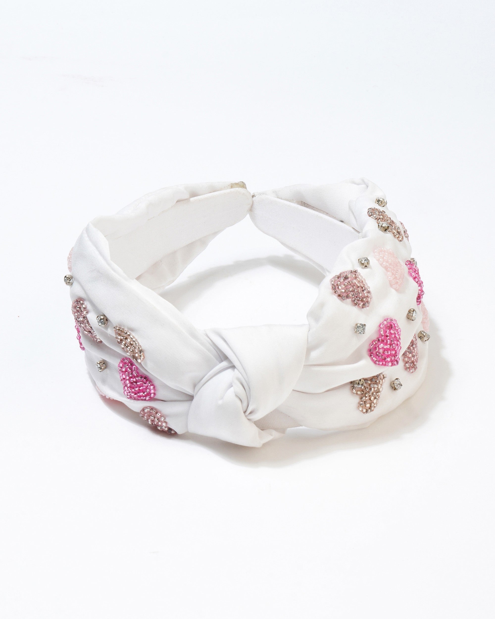 This charming white headband features a delightful heart motif, adorned with playful pink hearts that add a touch of whimsy to any outfit. The knot design not only enhances its aesthetic appeal but also ensures a secure and comfortable fit, making it perfect for both casual and formal occasions. Ideal for accessorizing your look, this headband is a must-have for those who appreciate a blend of style and fun.