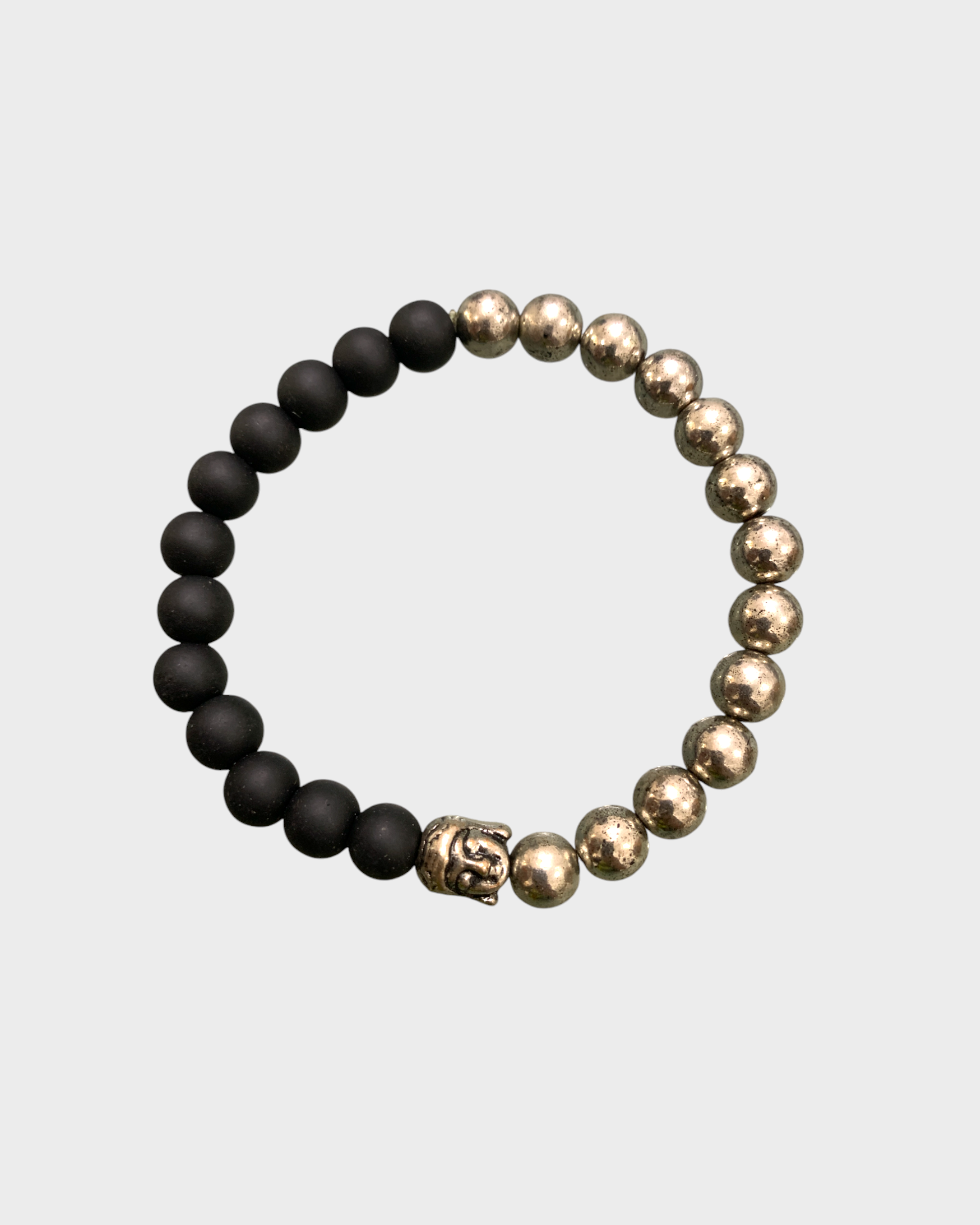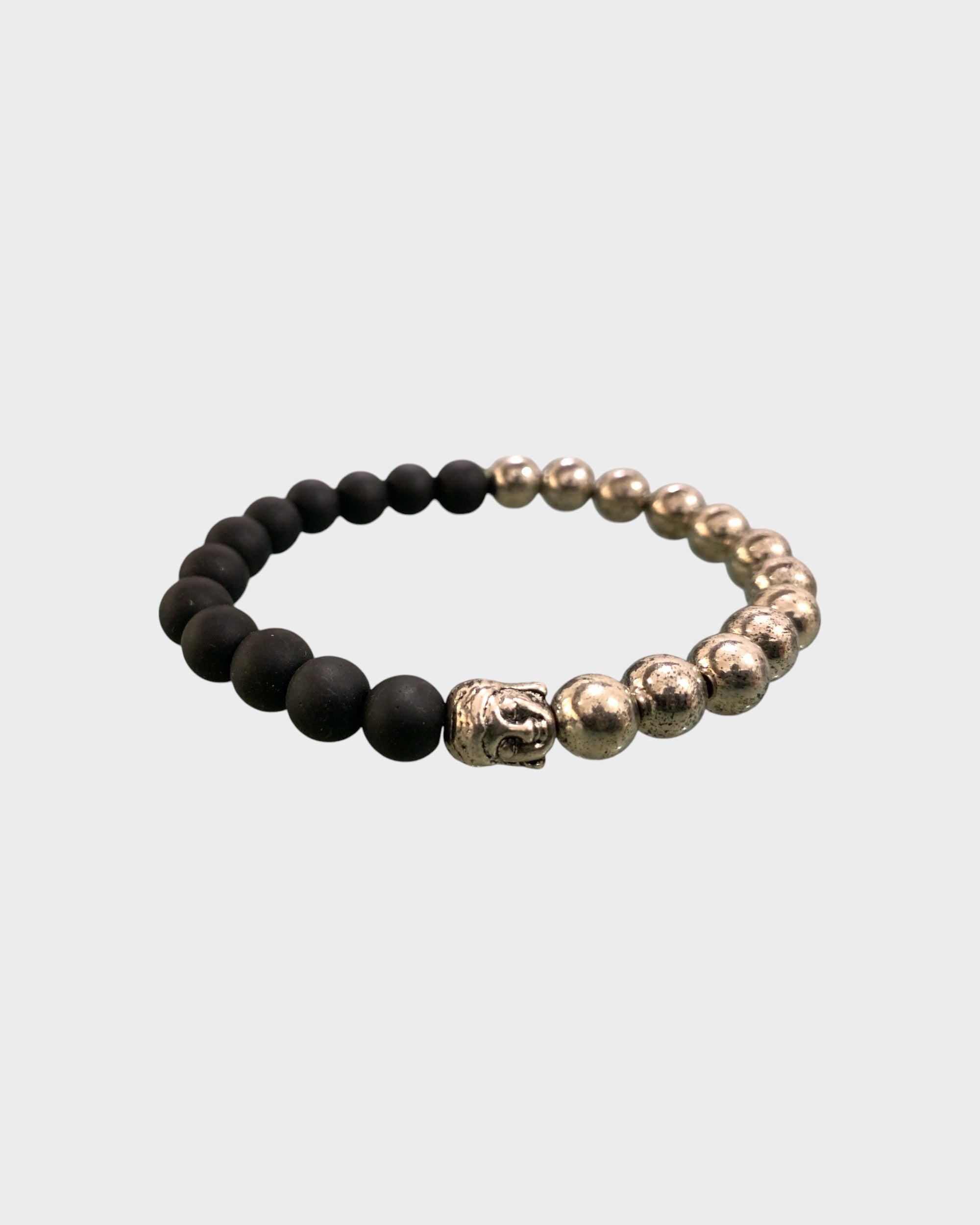 Enhance your style with this edgy bracelet which features a striking silver Buddha, adding a spiritual element to any outfit. It is the perfect accessory for those seeking protection, strength, positivity, and grounding. This bracelet also serves as a thoughtful gift for men.