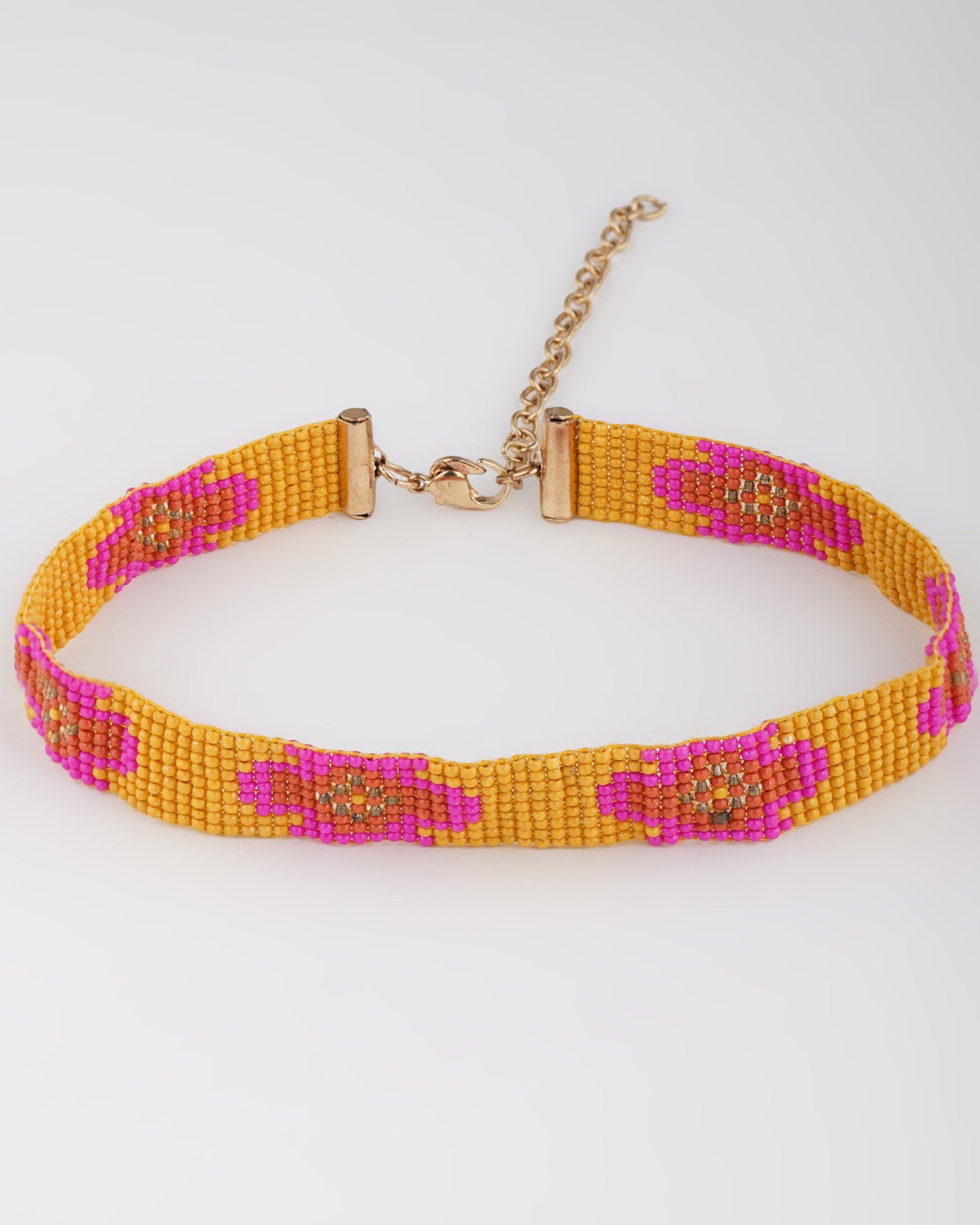 Brighten up your summer style with this stunning mustard and fushia beaded choker! Crafted from a delicate gold chain, it features vibrant flower beads that add a playful touch to any outfit. Perfect for those sunny days, this choker is a must-have accessory to elevate your look effortlessly.