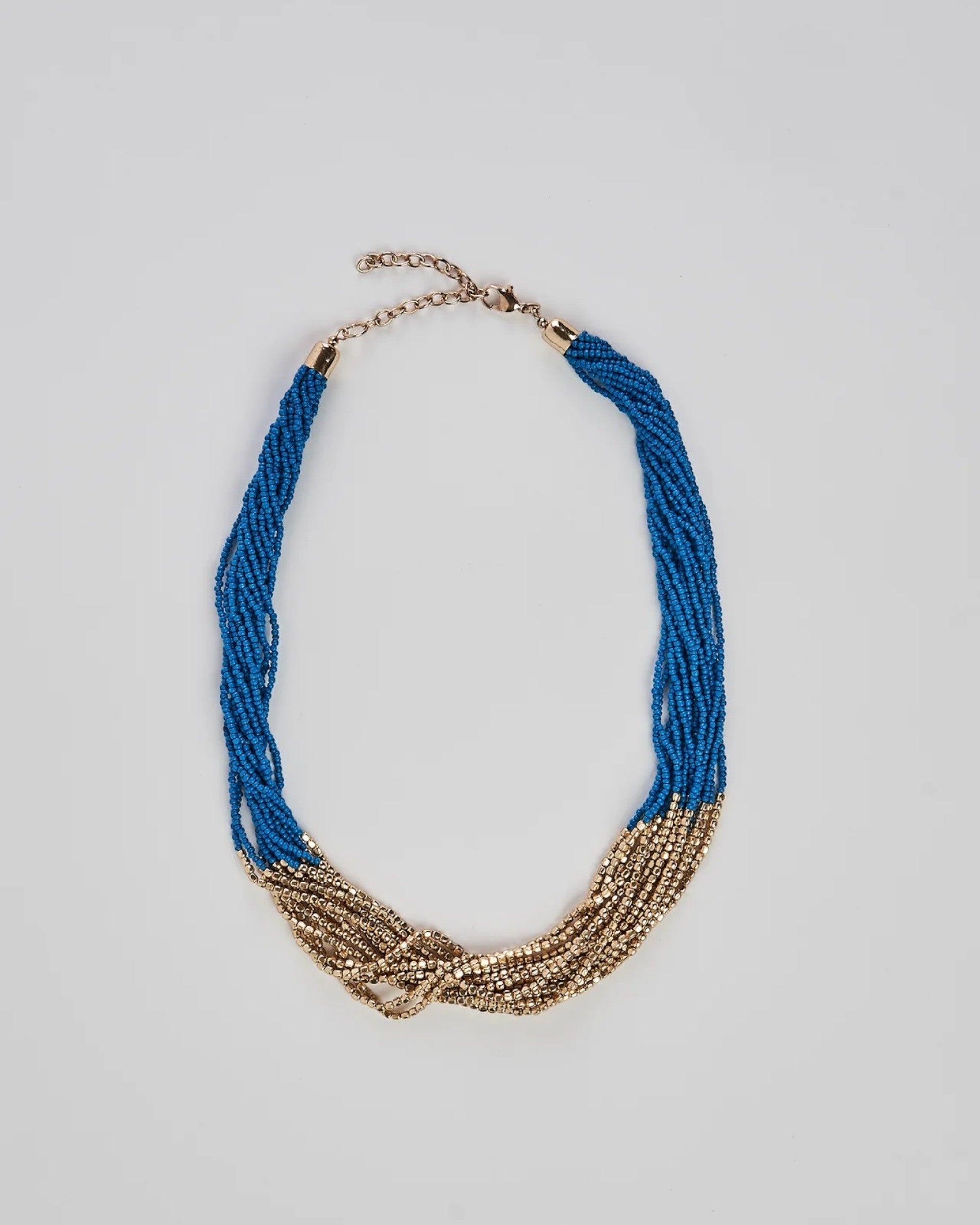 This stunning blue and gold necklace features two elegant strands that beautifully intertwine, creating a chic and sophisticated look. Perfect for dressing up any outfit, it adds a pop of color and a touch of luxury, making it a must-have accessory for any jewelry collection. Whether you're heading to a special event or just want to elevate your everyday style, this necklace is sure to turn heads.