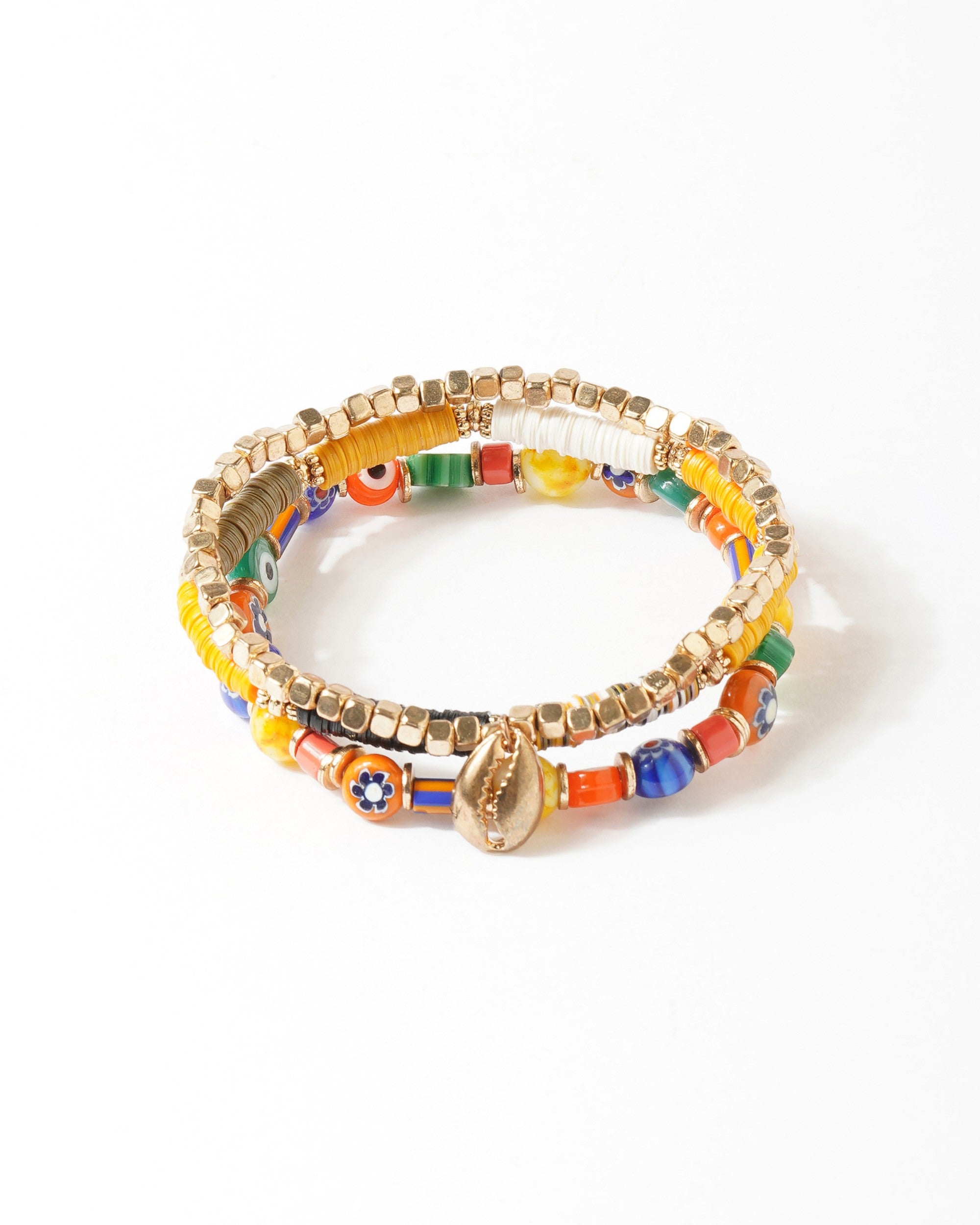 Gold Cowry Shell Rainbow Beaded Stretch Bracelets - 3 Pack