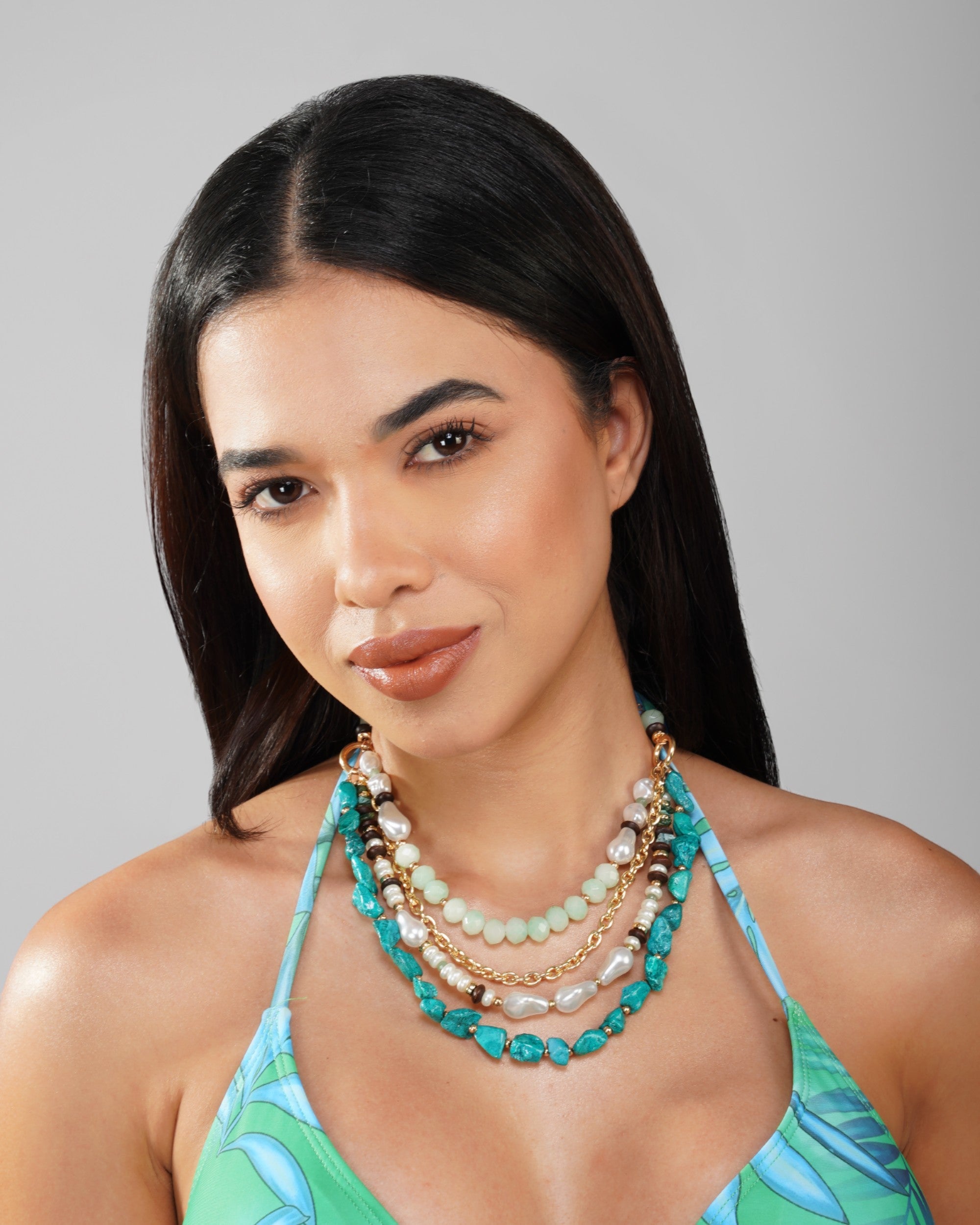 Expertly crafted with a combination of vibrant turquoise clay stones,wood beads and elegant pearls, this layered necklace features diverse shapes and sizes that add a touch of sophistication to any outfit. Finished off with gold-tone accents and a secure lobster clasp closure, it is the perfect accessory for elevating your style this season.