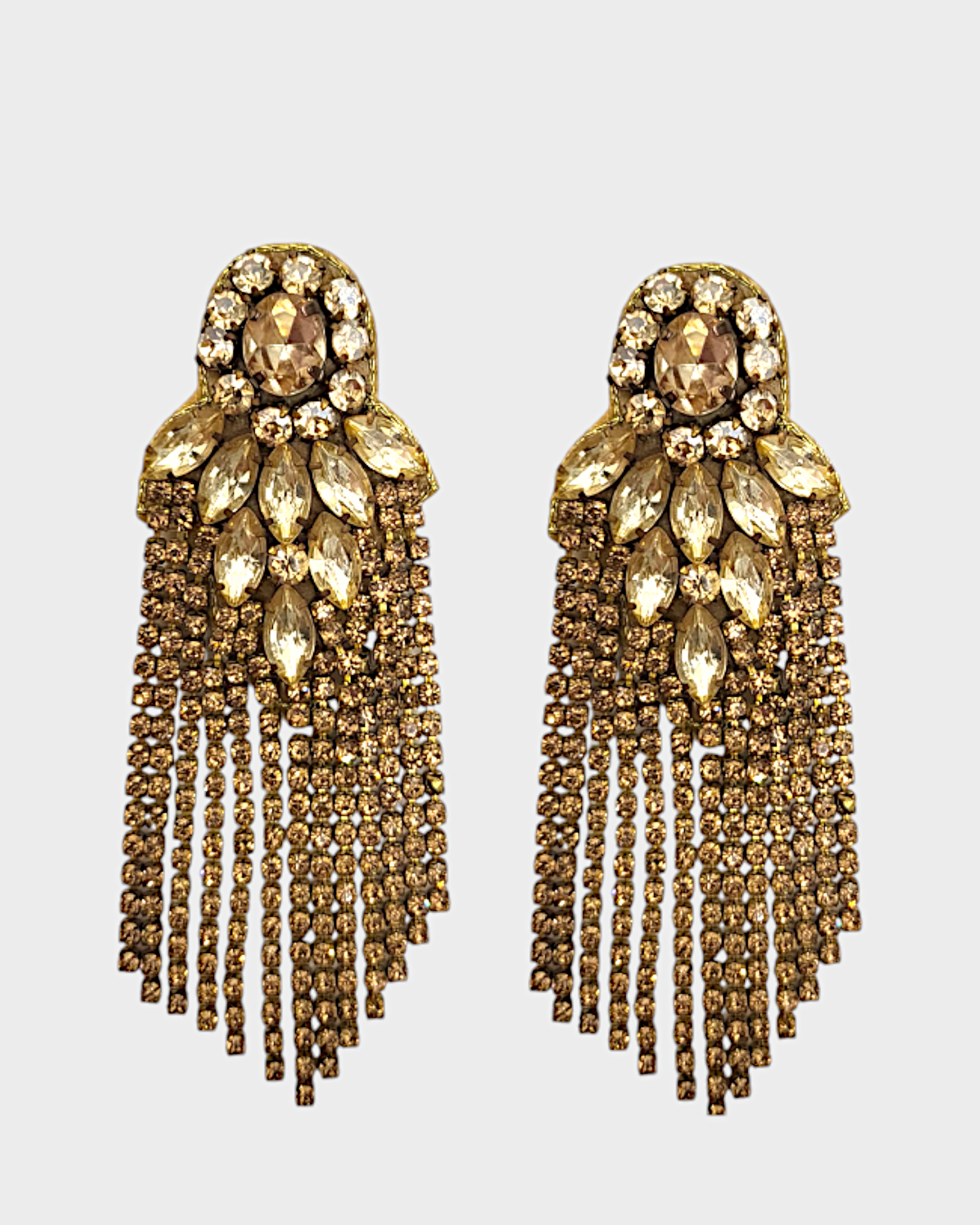 Elevate your style with these stunning gold tone earrings featuring a chic fringe design adorned with sparkling crystals. Perfect for adding a touch of glam to any outfit, these earrings are lightweight and comfortable, making them ideal for both day and night wear. Shine bright and make a statement with this eye-catching accessory!